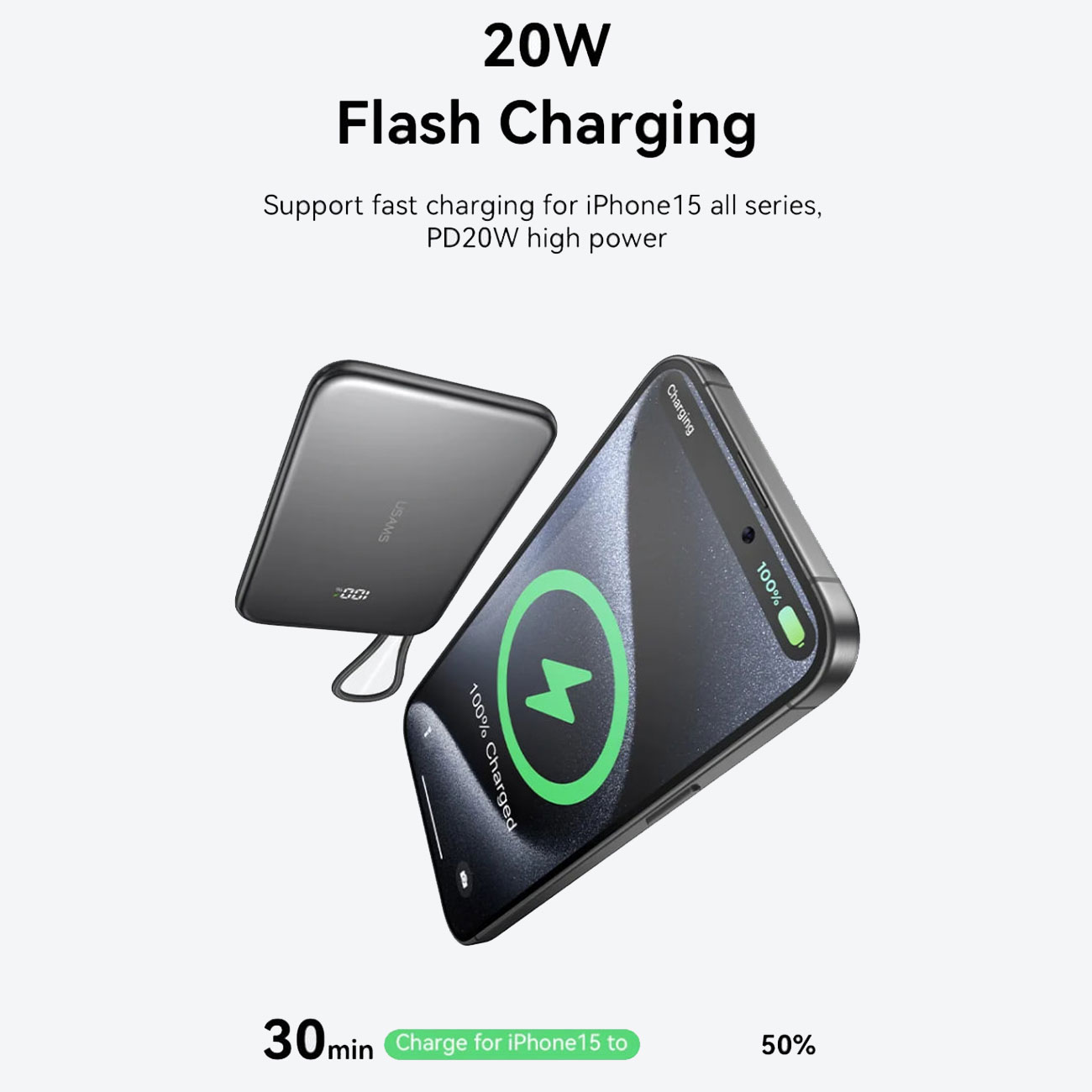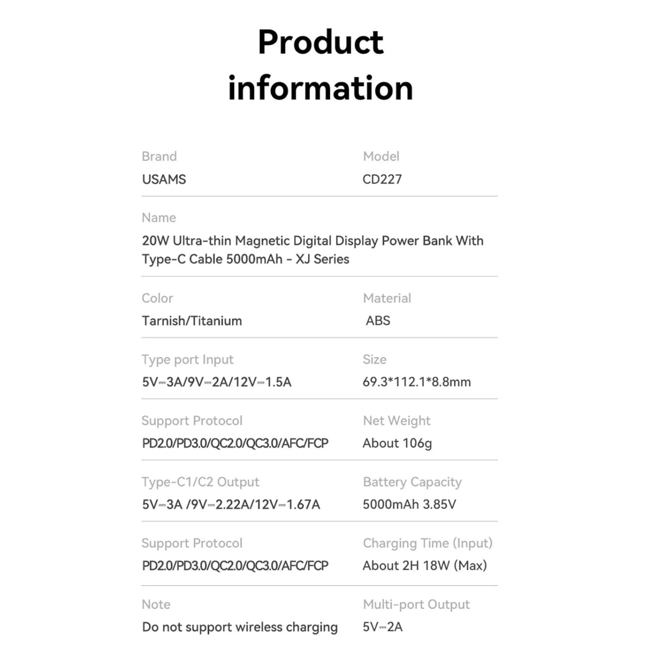 پاوربانک مگنتی 5000 فوق باریک با کابل Type-C یوسامز US-CD227