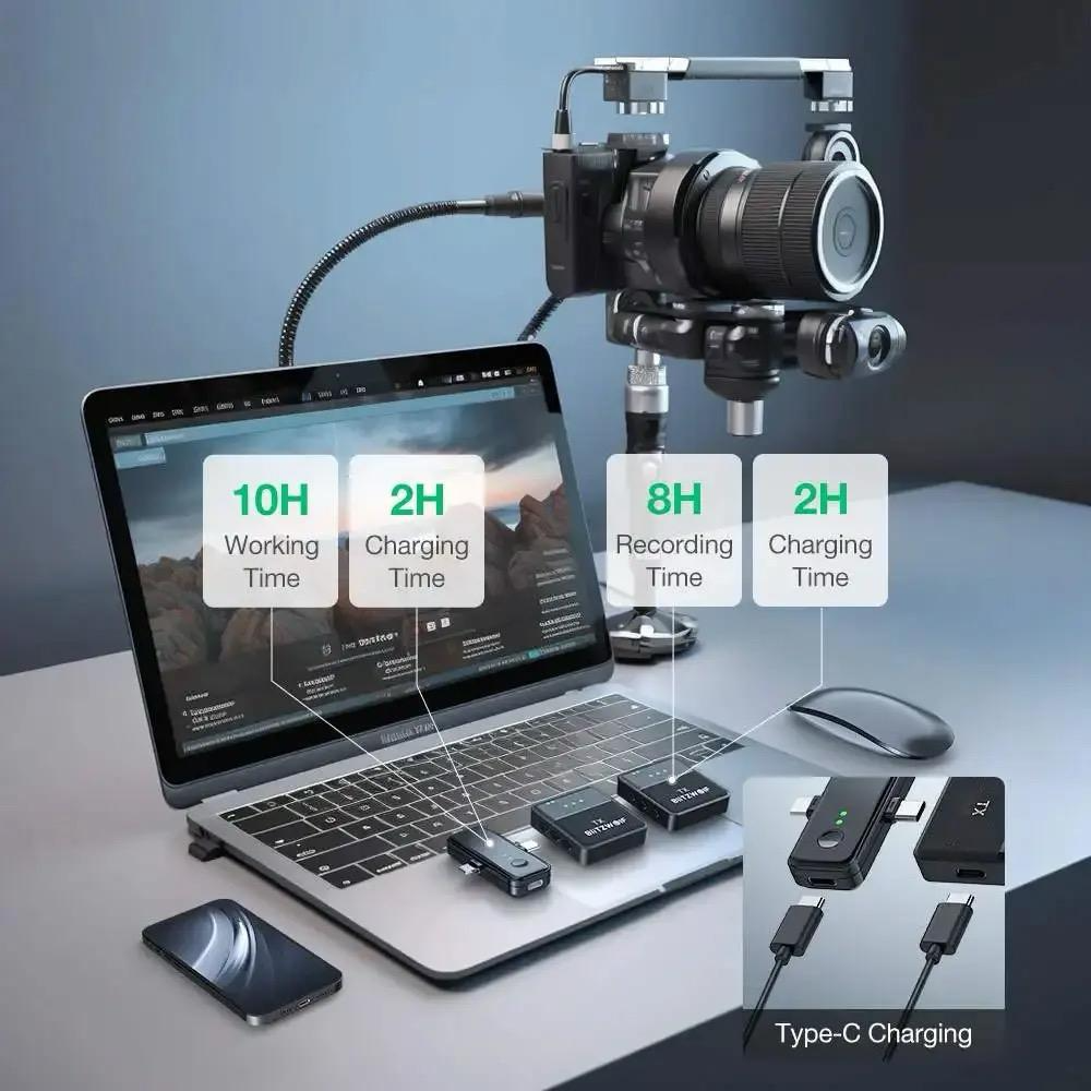 از نظر طراحی، این میکروفن ها بسیار سبک و کوچک هستند و به هیچ وجه مزاحمتی هنگام استفاده ایجاد نمی کنند. باتری داخلی قدرتمند هر میکروفن امکان استفاده چندین ساعته را فراهم می کند و با هر بار شارژ می توانید جلسات طولانی یا ضبط های حرفه ای را بدون نگرانی انجام دهید. شارژ آن ها نیز از طریق درگاه USB انجام می شود و به راحتی می توان آن ها را با پاوربانک یا لپ تاپ شارژ کرد.